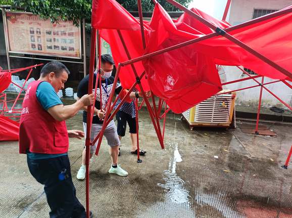 (暴雨后,志愿者们修复核酸检测点帐篷)