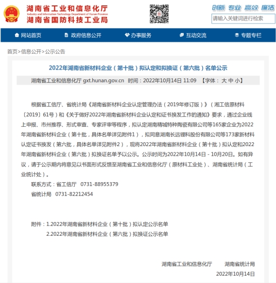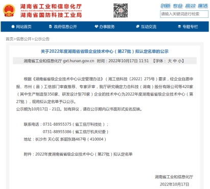 近日,湖南省工信厅相继公示了《2022年湖南省新材料企业(第十批)拟认定和拟换证(第六批)名单》和《2022年度湖南省省级企业技术中心(第27批)拟认定名单》,我市多家企业上榜。