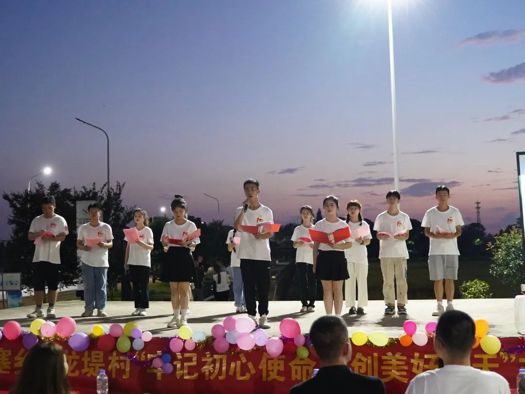 荷花一枝,夏意满塘。7月9日晚,当炎炎夏日落下带走整日的炙热,习习微风吹起汇聚欢乐的时光,张家塞乡新时代文明实践所主办的“牢记初心使命 共创美好明天”主题文艺晚会在乌龙堤村举行。湖南师范大学树达学院来乡暑期社会实践团和乌龙堤村村民齐聚一堂,抒发对党和国家的热爱,讴歌蓬勃发展的新时代。