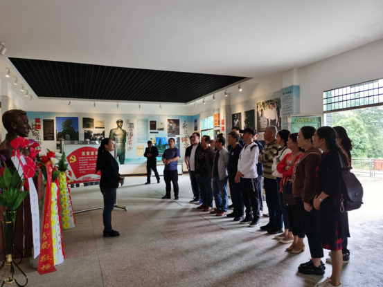 在马迹塘战史陈列馆,一段短视频带大家走进1949年战火纷飞的马迹塘。马迹塘战役历时两昼夜,演绎了一场以2000多人对20000余人的以少胜多的战例,近300名解放军官兵英勇牺牲。馆内展陈有英模照片、战争遗物、文献资料等,伴随着当地讲解员的逐步讲解,马迹塘战役的激战场面如电影般浮现。从陈列馆出来,大家迎着霏霏冷雨,步行到马迹塘烈士墓、纪念塔,瞻仰、鞠躬、默哀。“青山绿水留浩气,苍松翠柏慰英灵”。告别马迹塘烈士,大家来到了鸬鹚渡镇的张子清烈士纪念馆,向张子清烈士铜像敬献了花篮。在当地村干部的解说下,我们聆听了张子清卓越的指挥作战才能和“张师长献盐”的故事,惋惜因他的多次拒绝,最终伤口恶化,英年长眠东华岭。张子清同志一次次将生的希望留给战友,对党和人民赤胆忠心,为党的事业贡献了自己的一切。