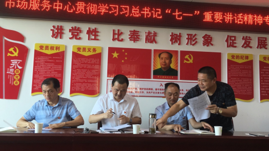 9月24日,市商务局副局长肖军到市场服务中心开展党支部联系点工作,并参加中心党总支部开展的学习习近平总书记“七一”重要讲话精神专题宣讲会,会议由市场服务中心主任王伟主持。