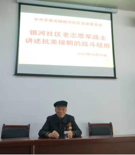 4月20日上午,银河社区党支部迎来了一届非常特殊而又激动人心的主题党日活动,在嘹亮的志愿军军歌声中,一位年过髦龄、胸前挂着两枚勋章的抗美援朝老志愿军战士来到了会场,到会的党员群众都非常的严肃认真,对老先生投以敬重和祝福的目光,会上老人家首先跟随社区书记重温入党誓词及党章,并聚精会神地看着投影播放的党史故事,“尚思为国戍轮台”而又矢志不渝的报国情怀仍在老战士心中常驻。